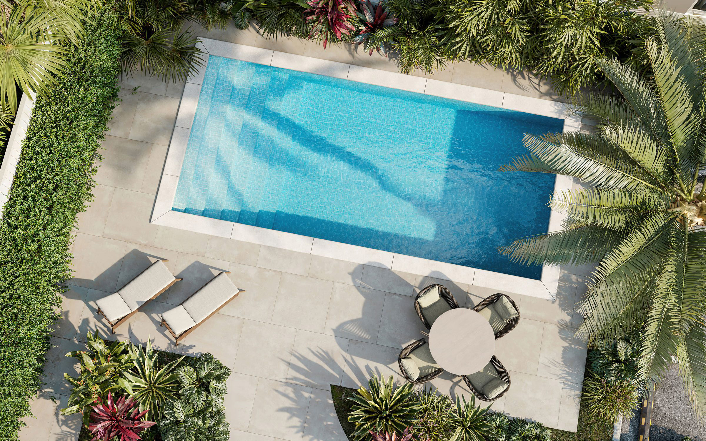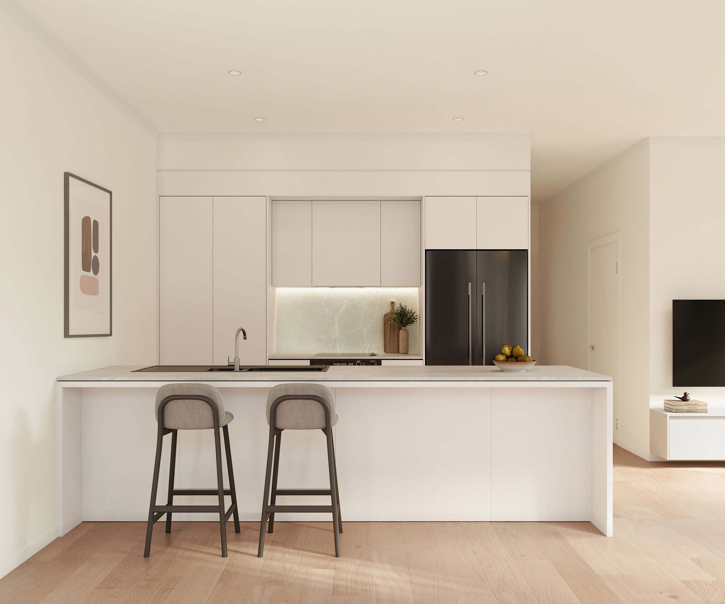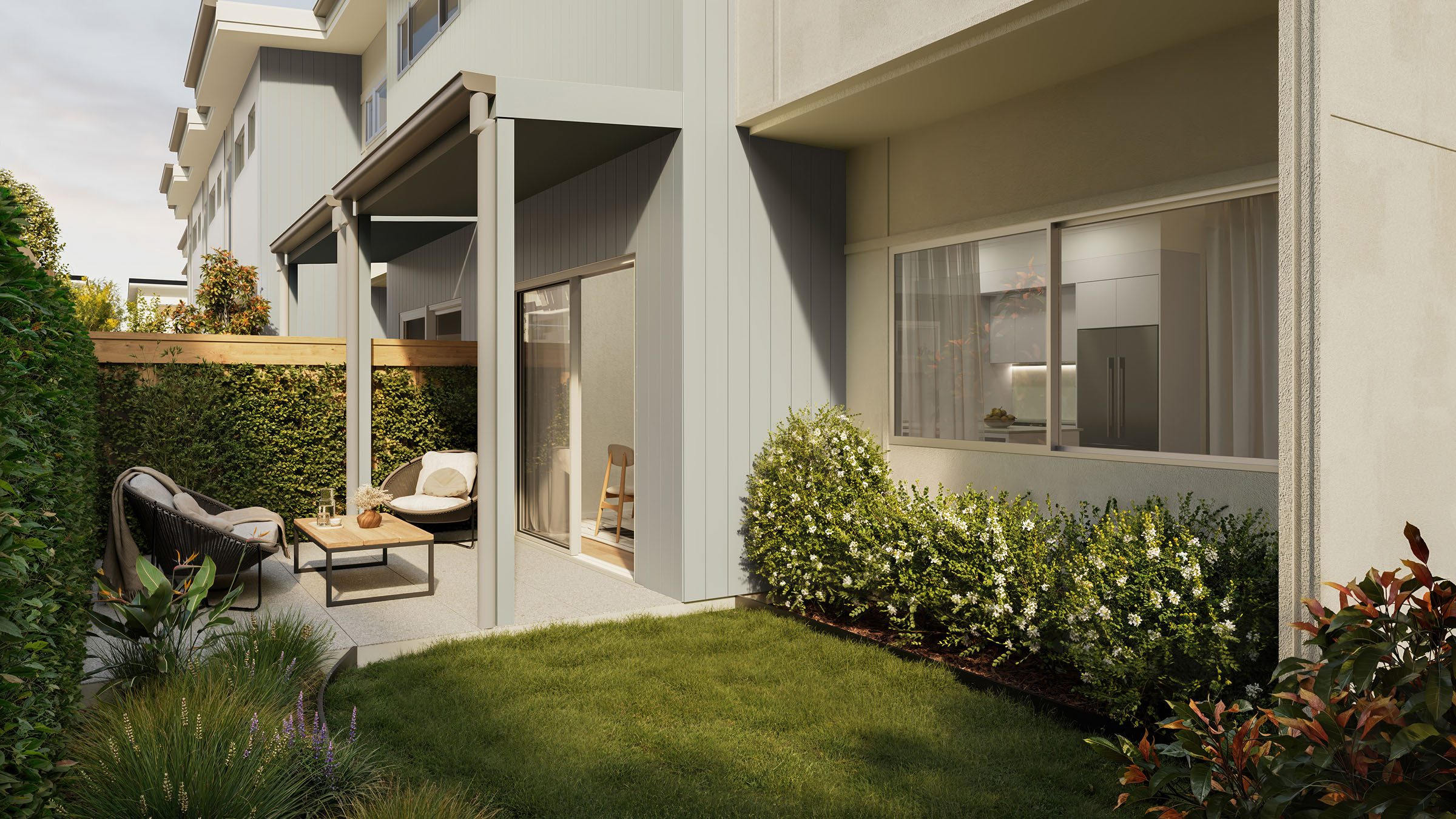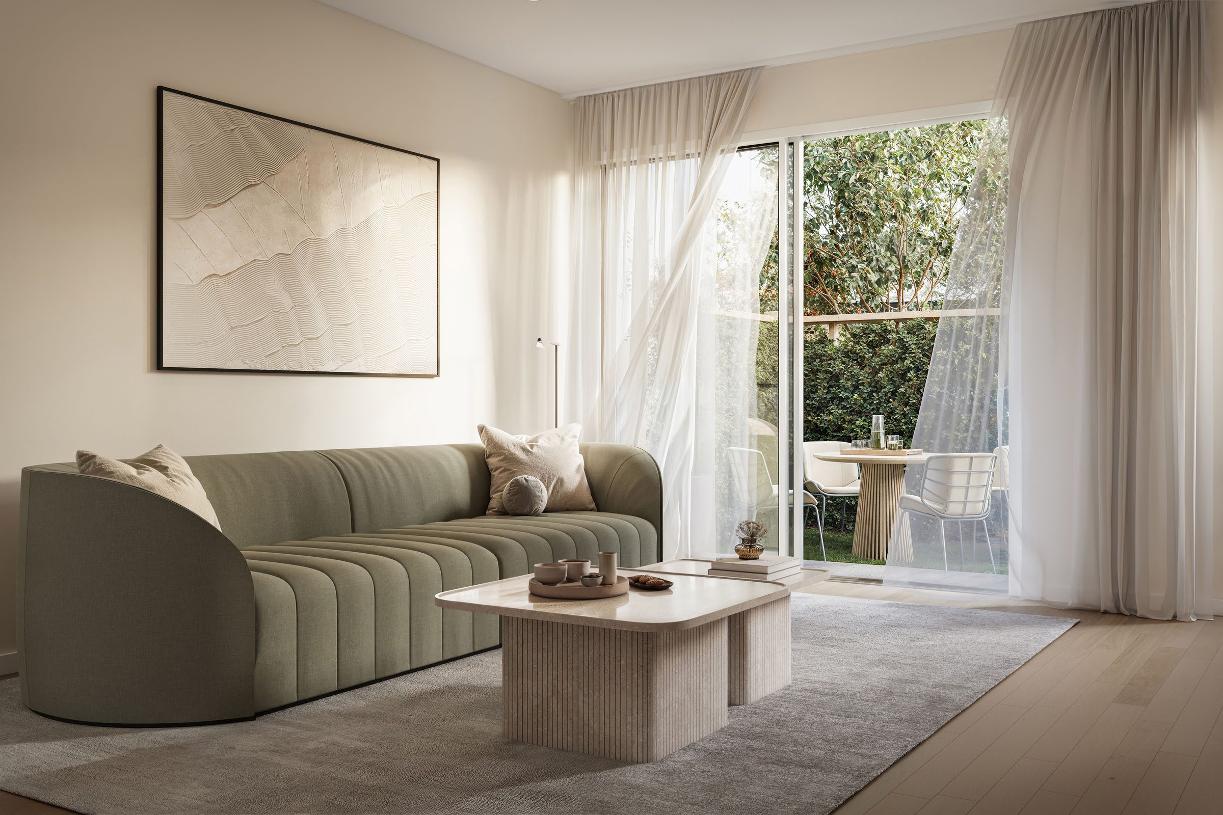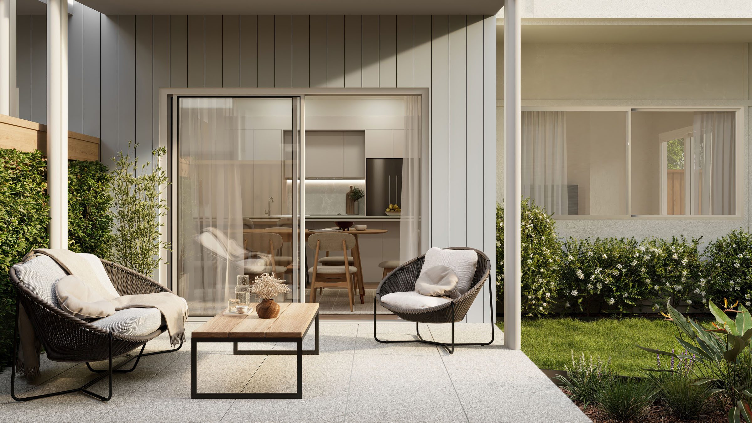 Large sliding doors extend the living areas to private courtyards and outdoor patios, creating the perfect setting for relaxed entertaining or quiet evenings at home.