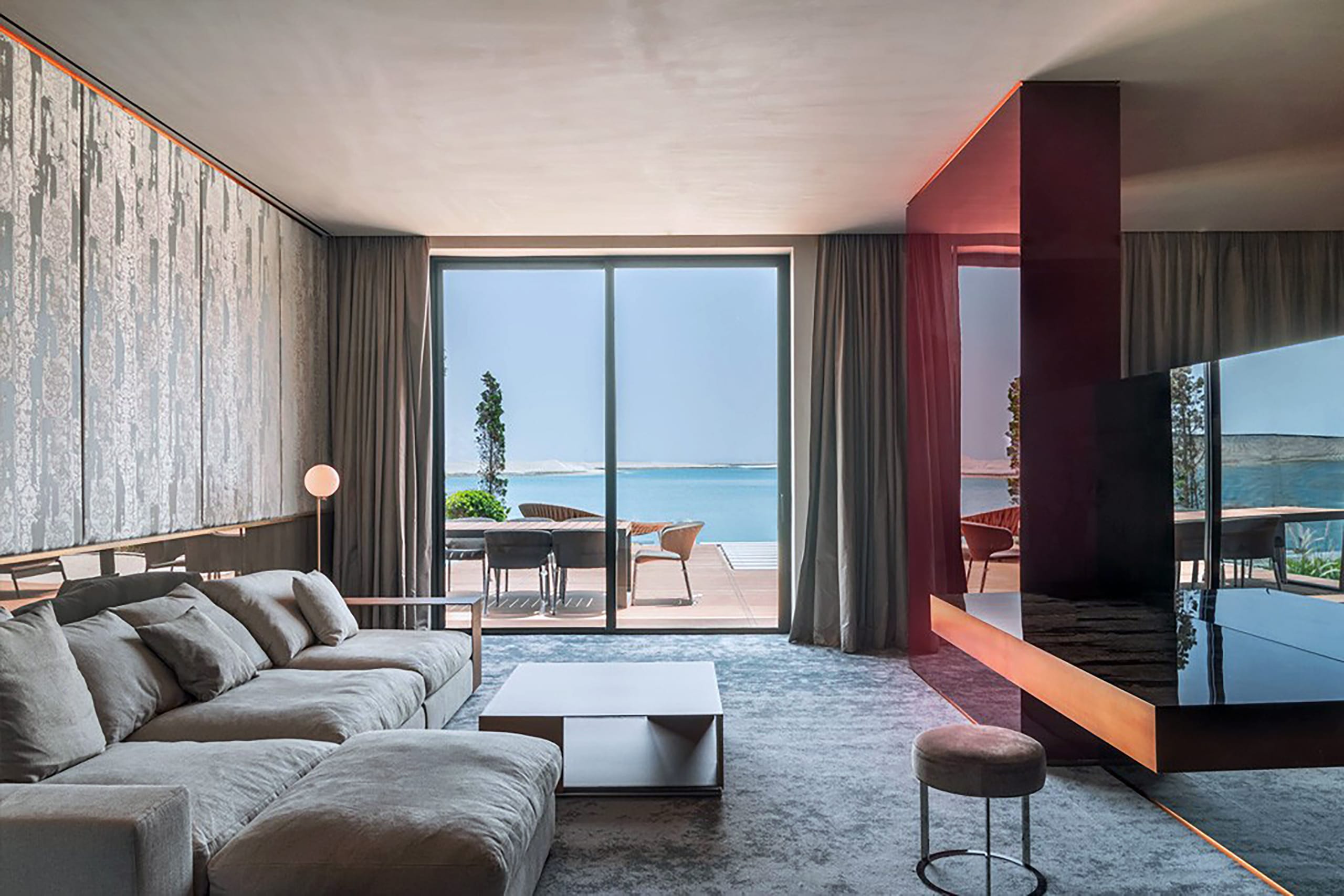The living spaces continue this seamless design approach, with features such as dual-view television systems that can be enjoyed from both the lounge and bedroom, enhancing everyday comfort and usability.